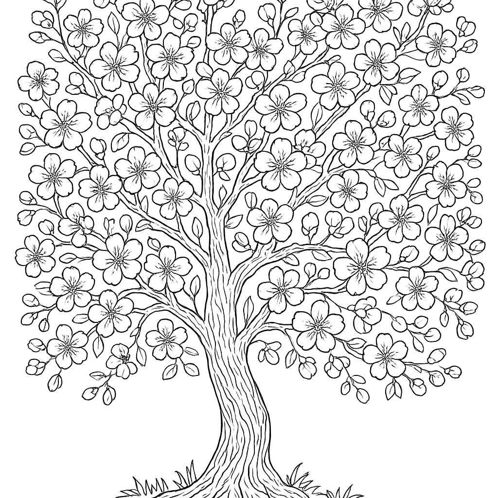 A detailed coloring page featuring cherry blossom tree in full bloom. Perfect for tweens (9-12) with intricate detail for a fun coloring experience.