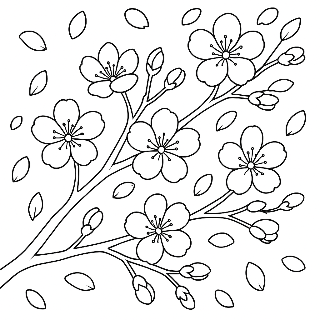 A medium coloring page featuring cherry blossoms on a tree branch with falling petals. Perfect for kids (6-9) with moderately detailed outlines for a fun coloring experience.