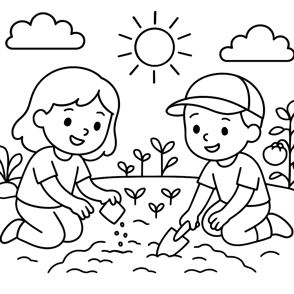 A simple coloring page featuring children planting seeds in a vegetable garden. Perfect for kids (4-6) with large, bold outlines for a fun coloring experience.