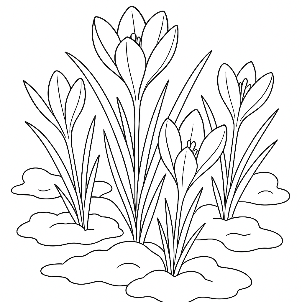 A medium coloring page featuring crocus flowers blooming in snow patches. Perfect for kids (6-9) with moderately detailed outlines for a fun coloring experience.