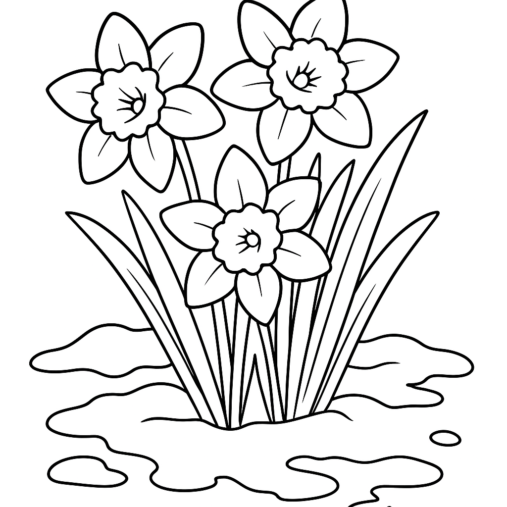 A simple coloring page featuring daffodils pushing through melting snow. Perfect for kids (4-6) with large, bold outlines for a fun coloring experience.