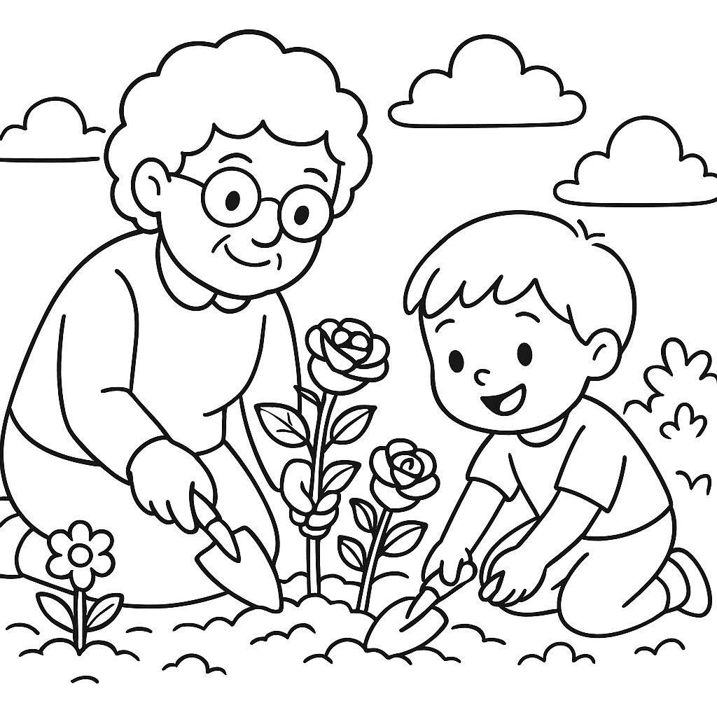 A medium coloring page featuring grandmother and child planting roses together. Perfect for kids (4-6) with moderately detailed outlines for a fun coloring experience.