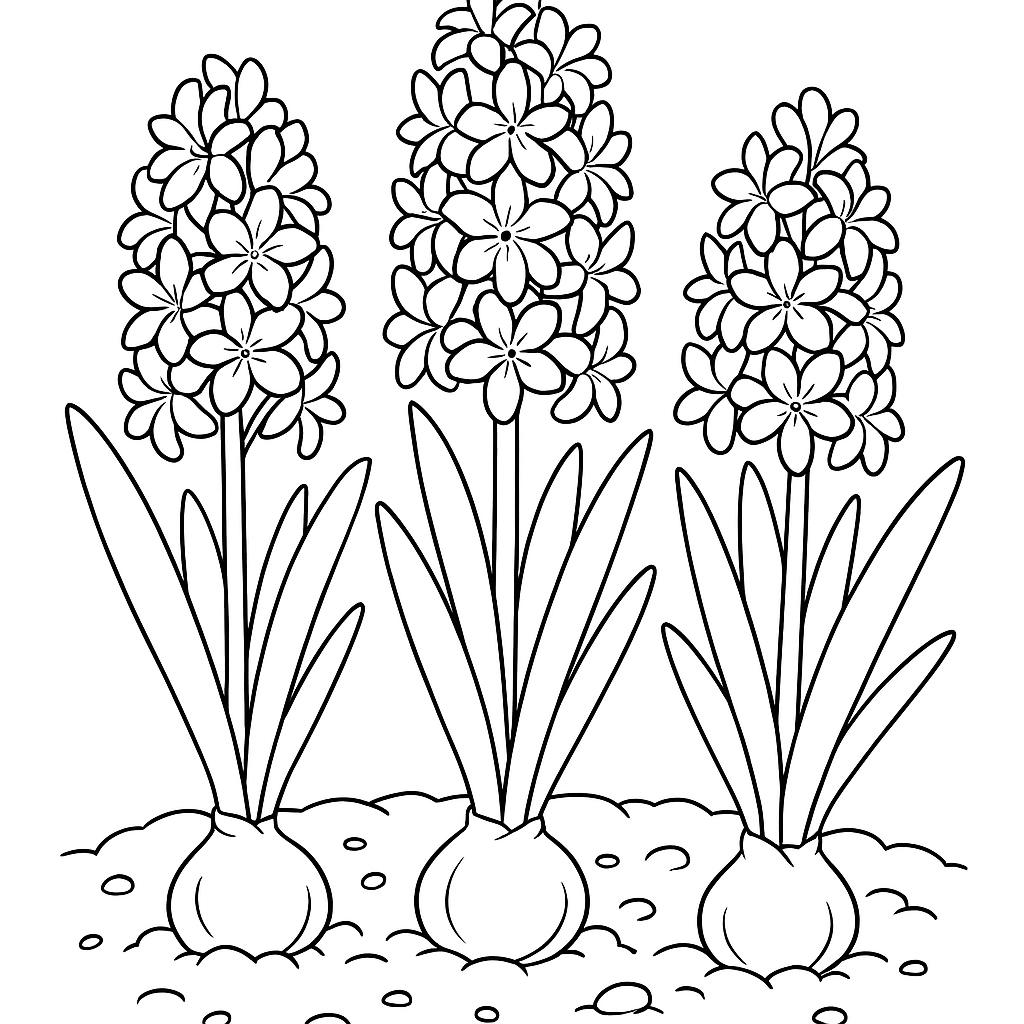 A medium coloring page featuring hyacinth flowers pushing through soil. Perfect for kids (6-9) with moderately detailed outlines for a fun coloring experience.