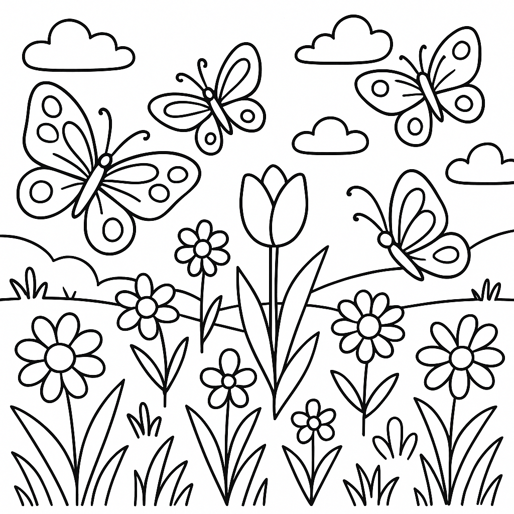 A medium coloring page featuring a spring meadow with butterflies and blooming flowers. Perfect for kids (6-9) with moderately detailed outlines for a fun coloring experience.