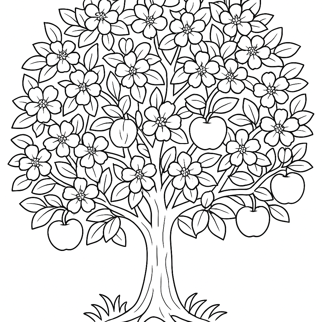 A detailed coloring page featuring an apple tree blooming with pink and white flowers. Perfect for kids (6-9) with intricate detail for a fun coloring experience.