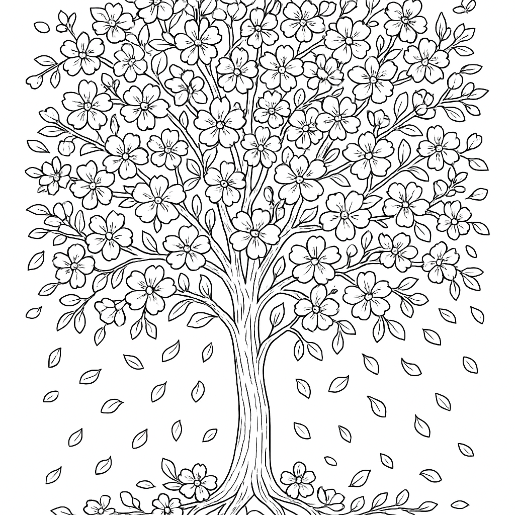 A detailed coloring page featuring cherry blossom tree with falling petals. Perfect for tweens (9-12) with intricate detail for a fun coloring experience.