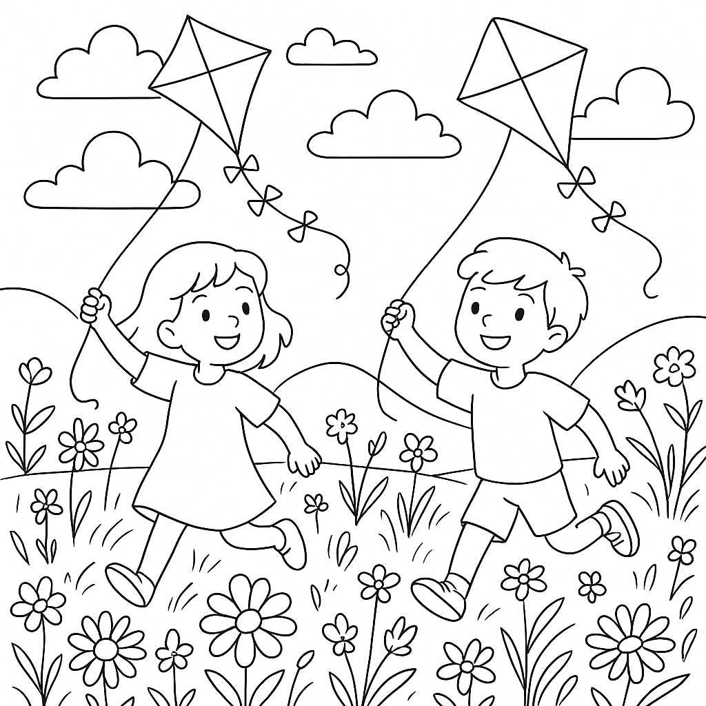 A medium coloring page featuring children flying kites in a spring meadow with wildflowers. Perfect for kids (6-9) with moderately detailed outlines for a fun coloring experience.