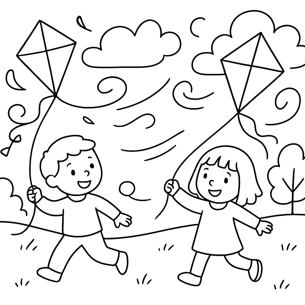 A simple coloring page featuring children flying kites on a windy April day. Perfect for kids (4-6) with large, bold outlines for a fun coloring experience.