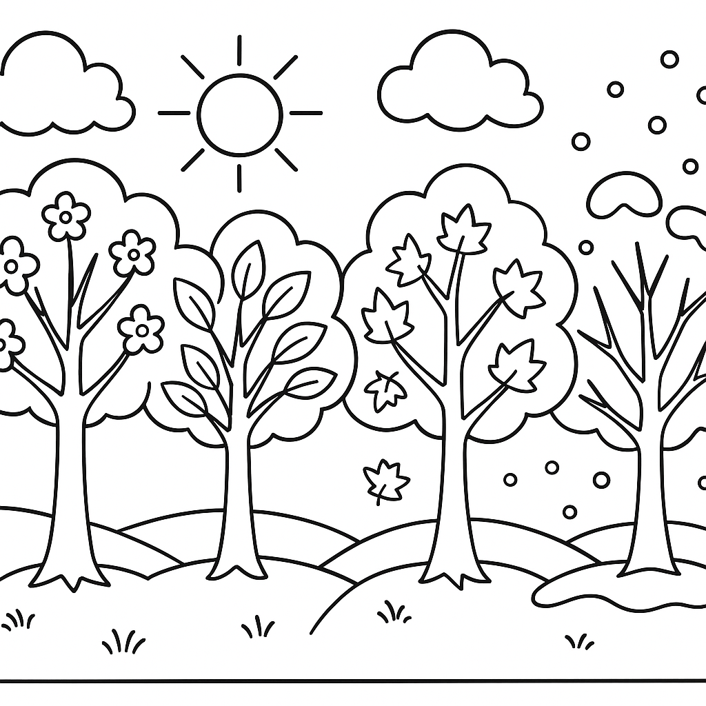 A simple coloring page featuring same tree shown in all four seasons side by side. Perfect for kids (4-6) with large, bold outlines for a fun coloring experience.