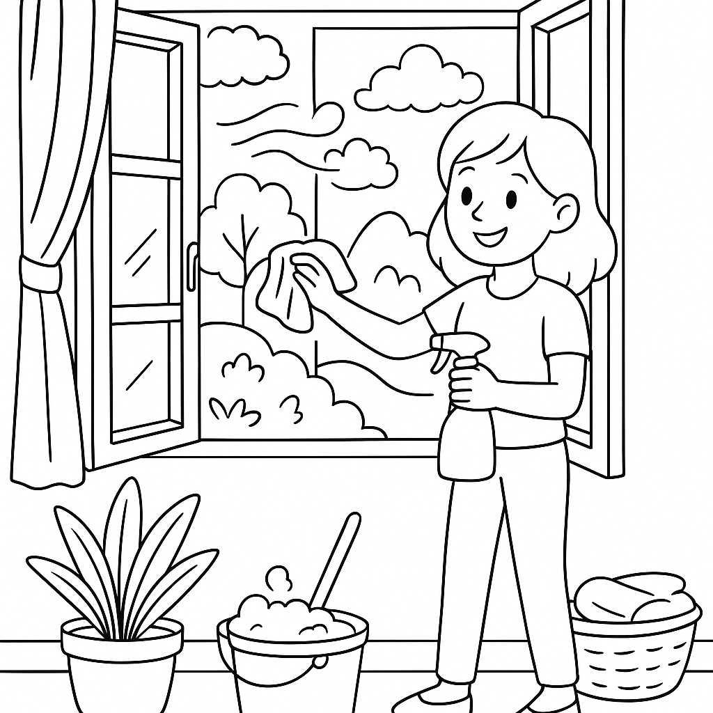 A medium coloring page featuring spring cleaning scene with open windows and fresh air. Perfect for kids (6-9) with moderately detailed outlines for a fun coloring experience.