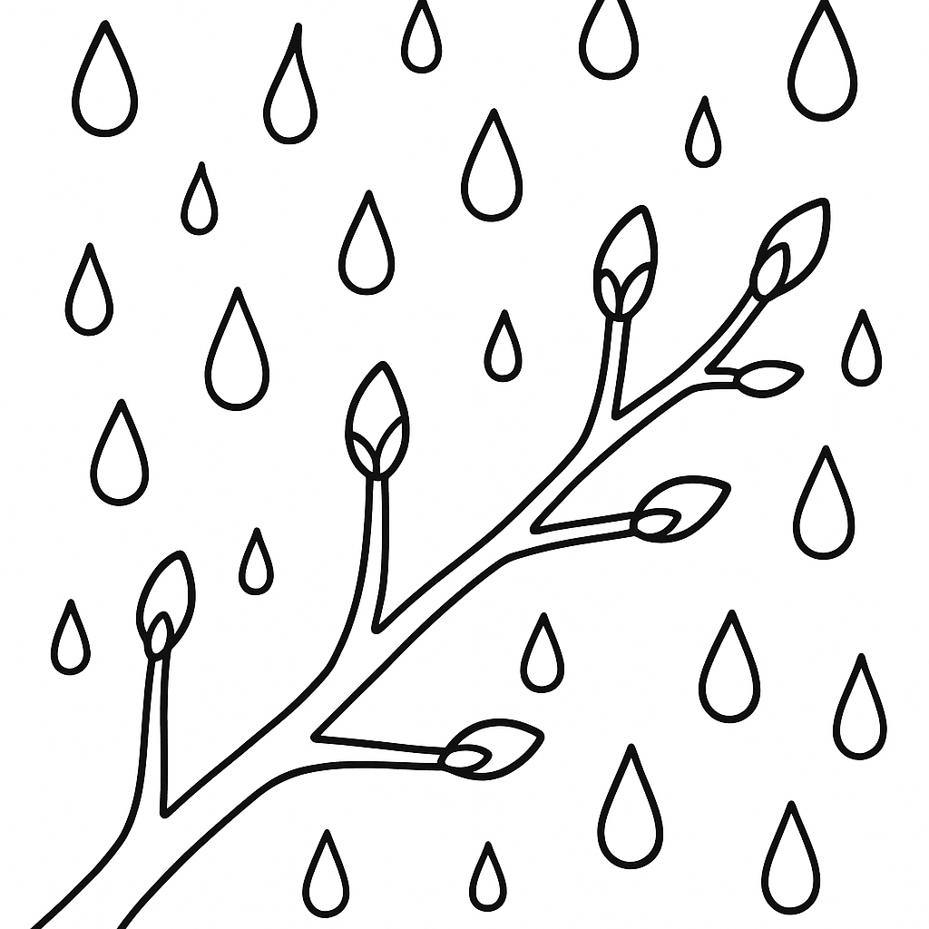 A simple coloring page featuring spring rain falling on budding tree branches. Perfect for kids (4-6) with large, bold outlines for a fun coloring experience.