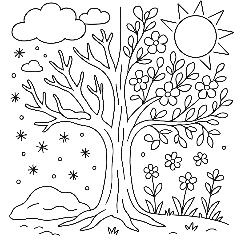 A medium coloring page featuring tree showing transition from winter to spring. Perfect for kids (6-9) with moderately detailed outlines for a fun coloring experience.