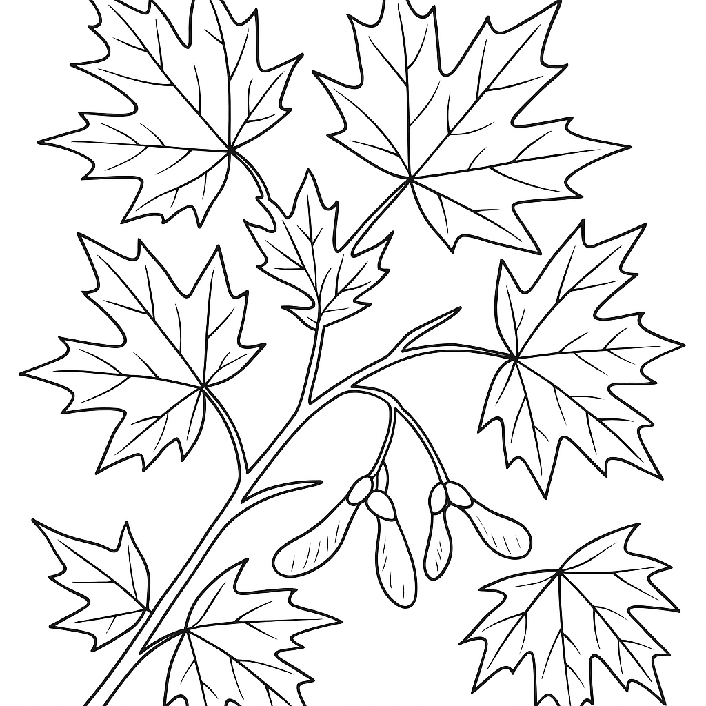 A medium coloring page featuring a maple tree with new spring leaves and helicopter seeds. Perfect for kids (6-9) with moderately detailed outlines for a fun coloring experience.