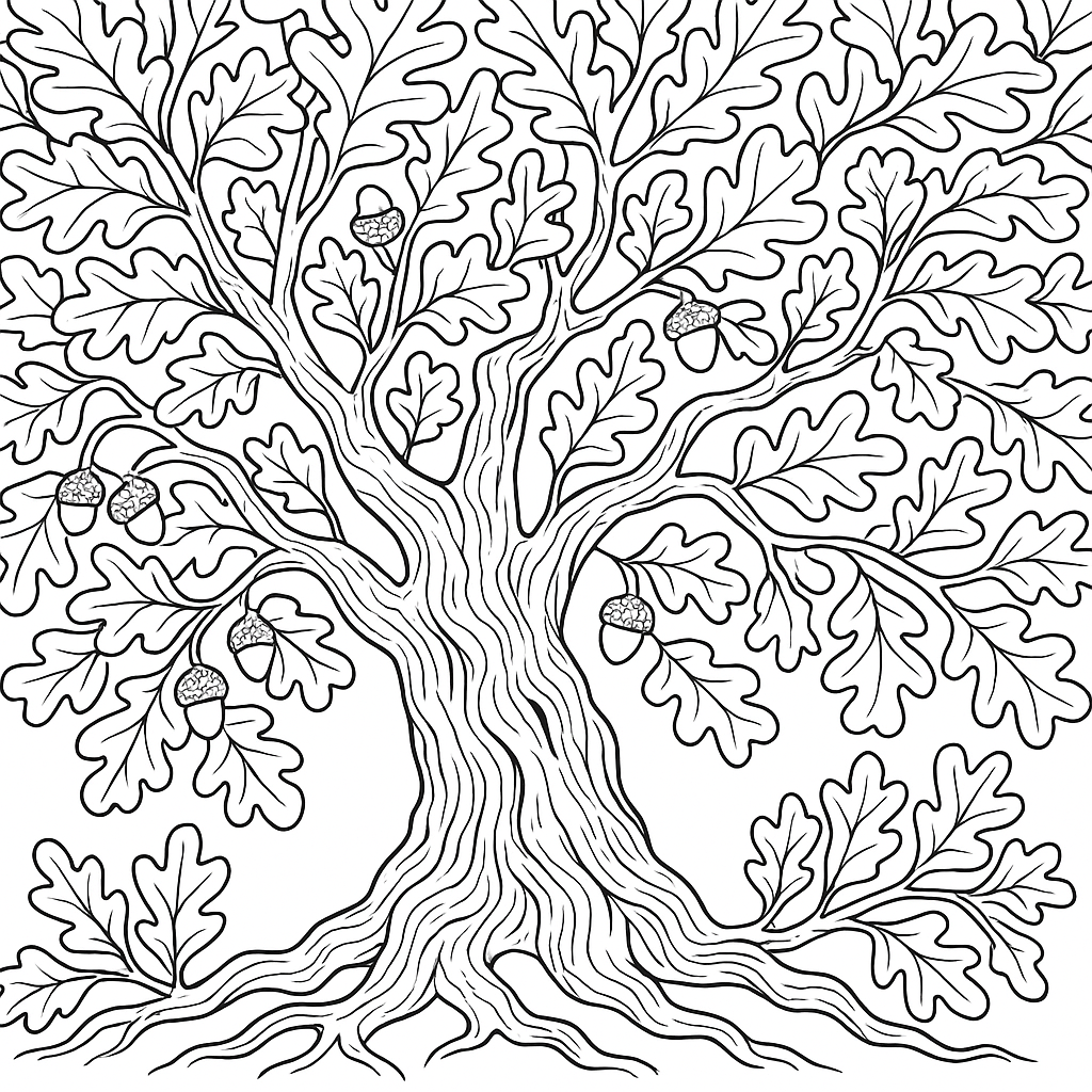 A detailed coloring page featuring ancient oak tree with new spring leaves and acorns. Perfect for kids (6-9) with intricate detail for a fun coloring experience.