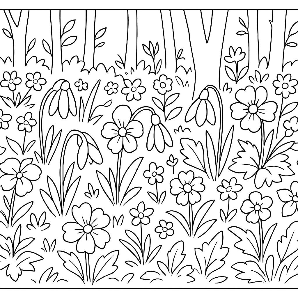A medium coloring page featuring forest floor covered with spring wildflowers. Perfect for kids (6-9) with moderately detailed outlines for a fun coloring experience.