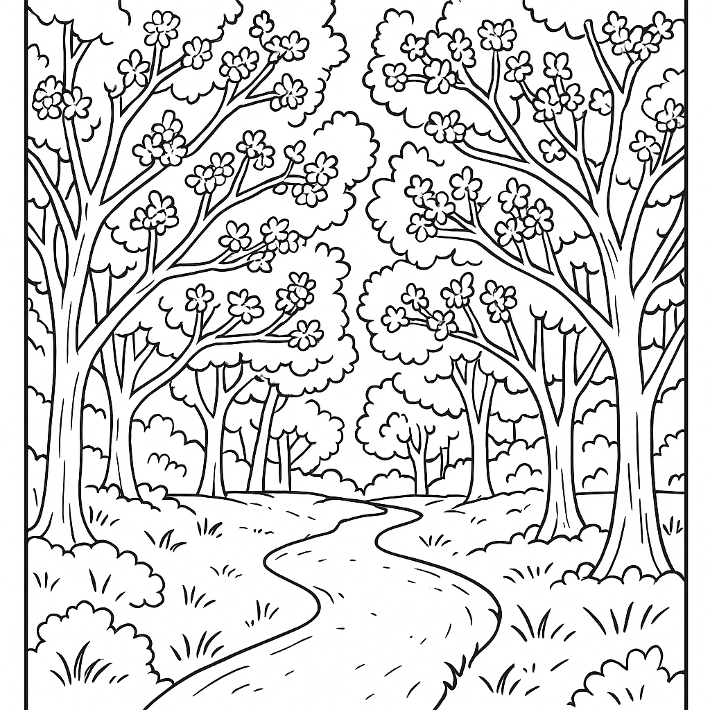 A medium coloring page featuring forest path lined with blooming redbud trees. Perfect for kids (6-9) with moderately detailed outlines for a fun coloring experience.