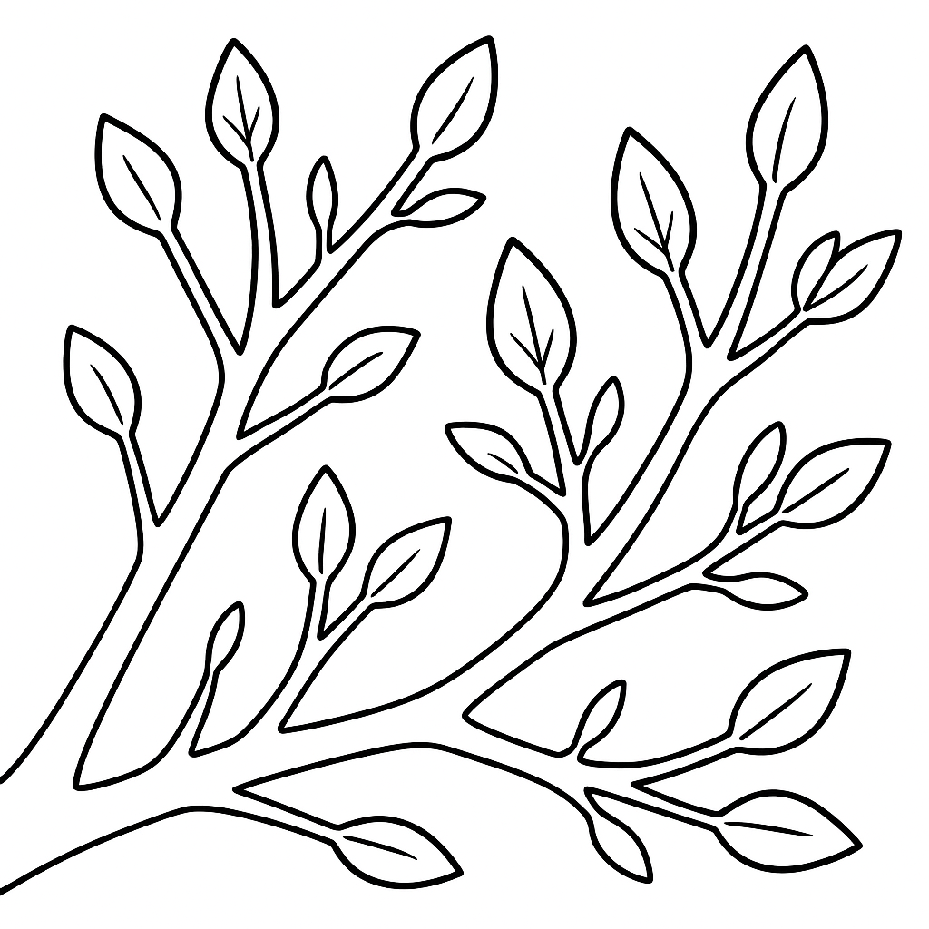 A simple coloring page featuring new leaves budding on bare tree branches. Perfect for kids (4-6) with large, bold outlines for a fun coloring experience.