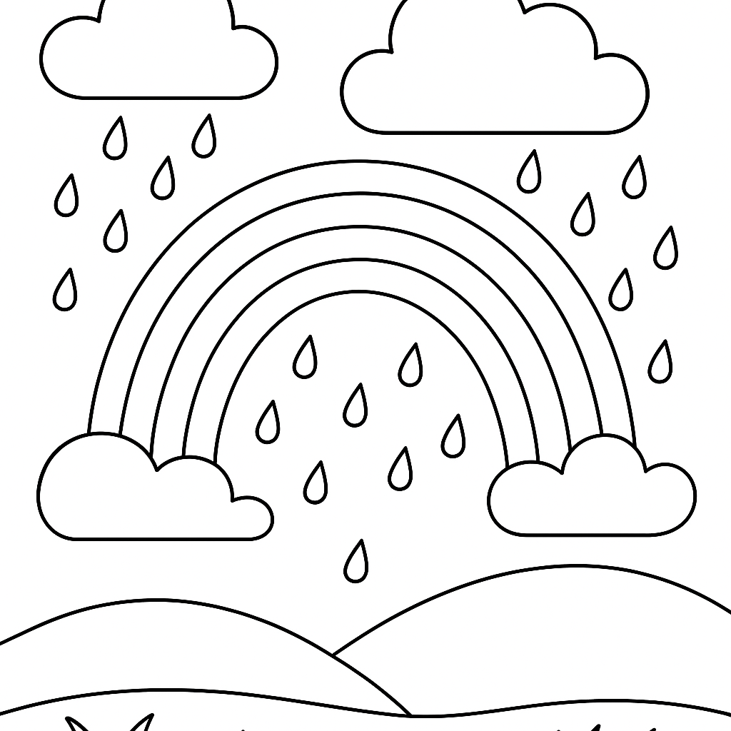 A simple coloring page featuring a gentle spring rain shower with rainbow appearing. Perfect for kids (4-6) with large, bold outlines for a fun coloring experience.