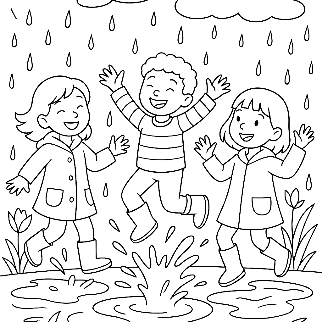 A medium coloring page featuring children jumping in spring rain puddles. Perfect for kids (6-9) with moderately detailed outlines for a fun coloring experience.