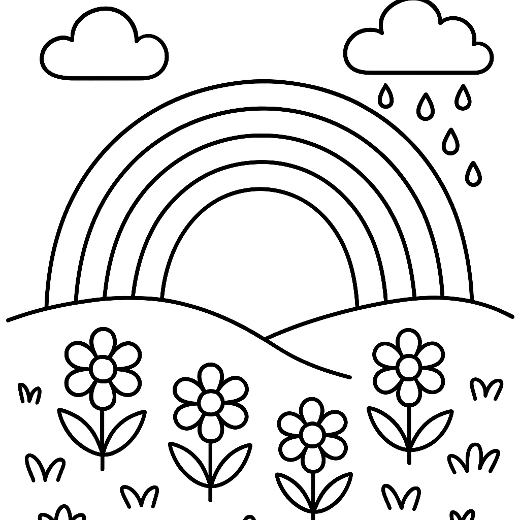 A simple coloring page featuring rainbow after spring rain shower over meadow. Perfect for toddlers (2-4) with large, bold outlines for a fun coloring experience.