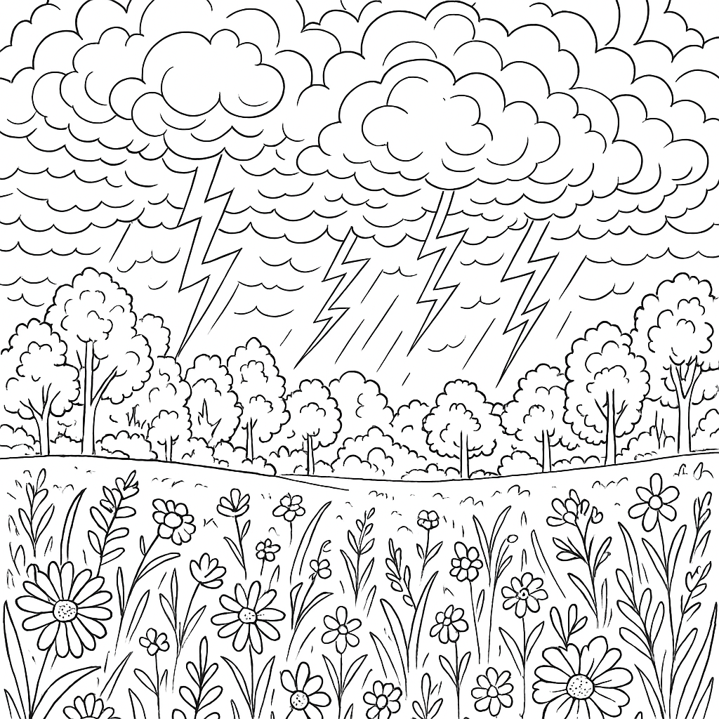A detailed coloring page featuring storm clouds gathering over a meadow with lightning. Perfect for tweens (9-12) with intricate detail for a fun coloring experience.