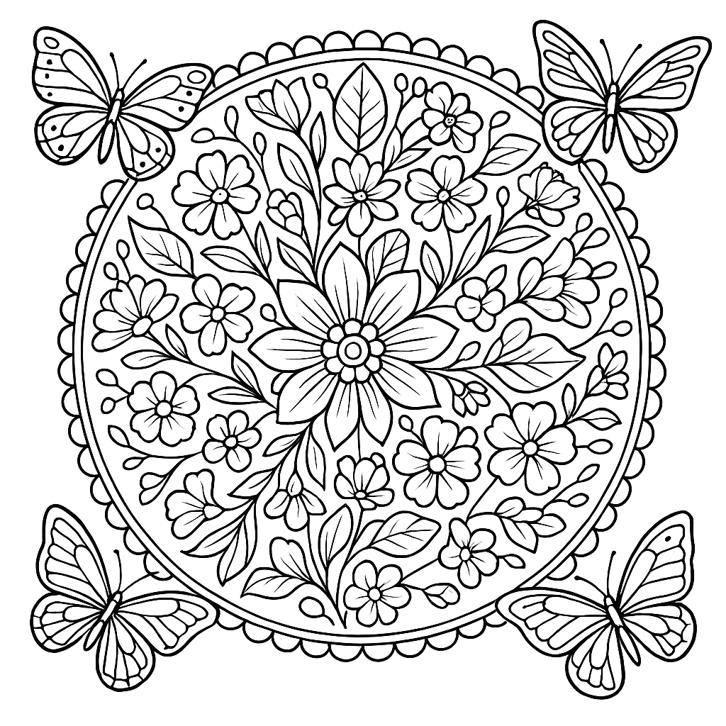 A detailed coloring page featuring a mandala design featuring spring flowers and butterflies. Perfect for tweens (9-12) with intricate detail for a fun coloring experience.