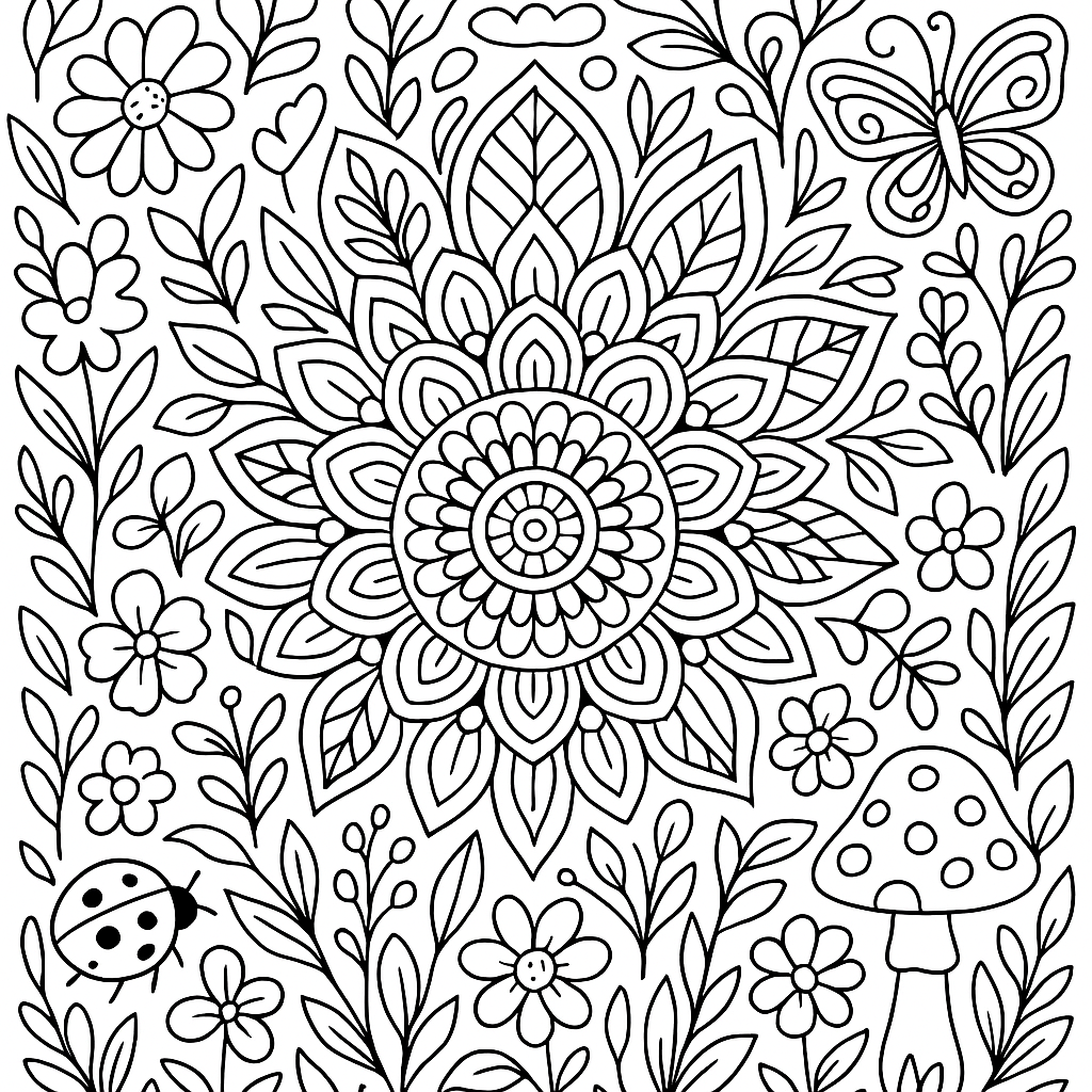 A detailed coloring page featuring flower mandala with petals and garden elements. Perfect for tweens (9-12) with intricate detail for a fun coloring experience.