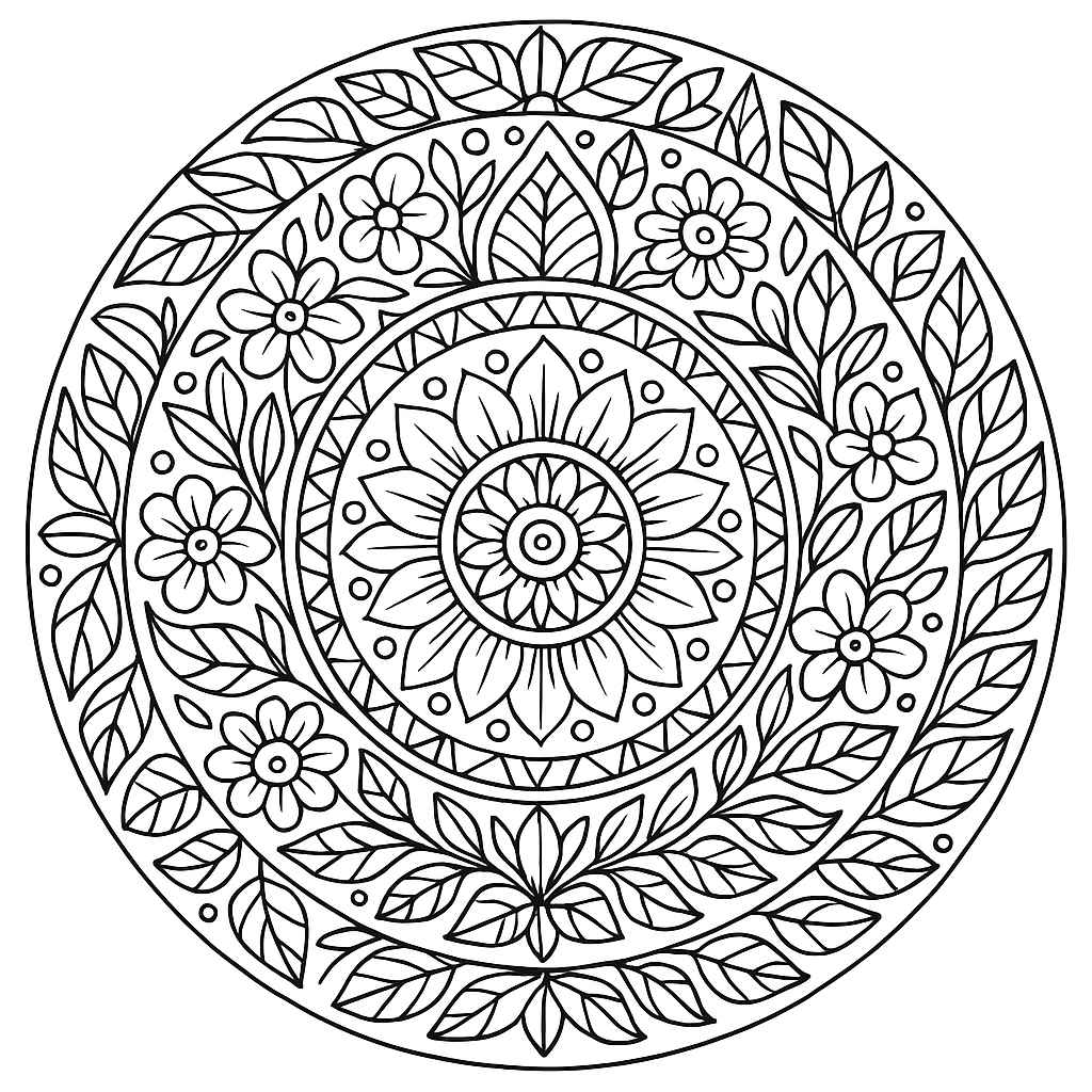 A detailed coloring page featuring nature mandala with leaves, flowers, and geometric shapes. Perfect for tweens (9-12) with intricate detail for a fun coloring experience.