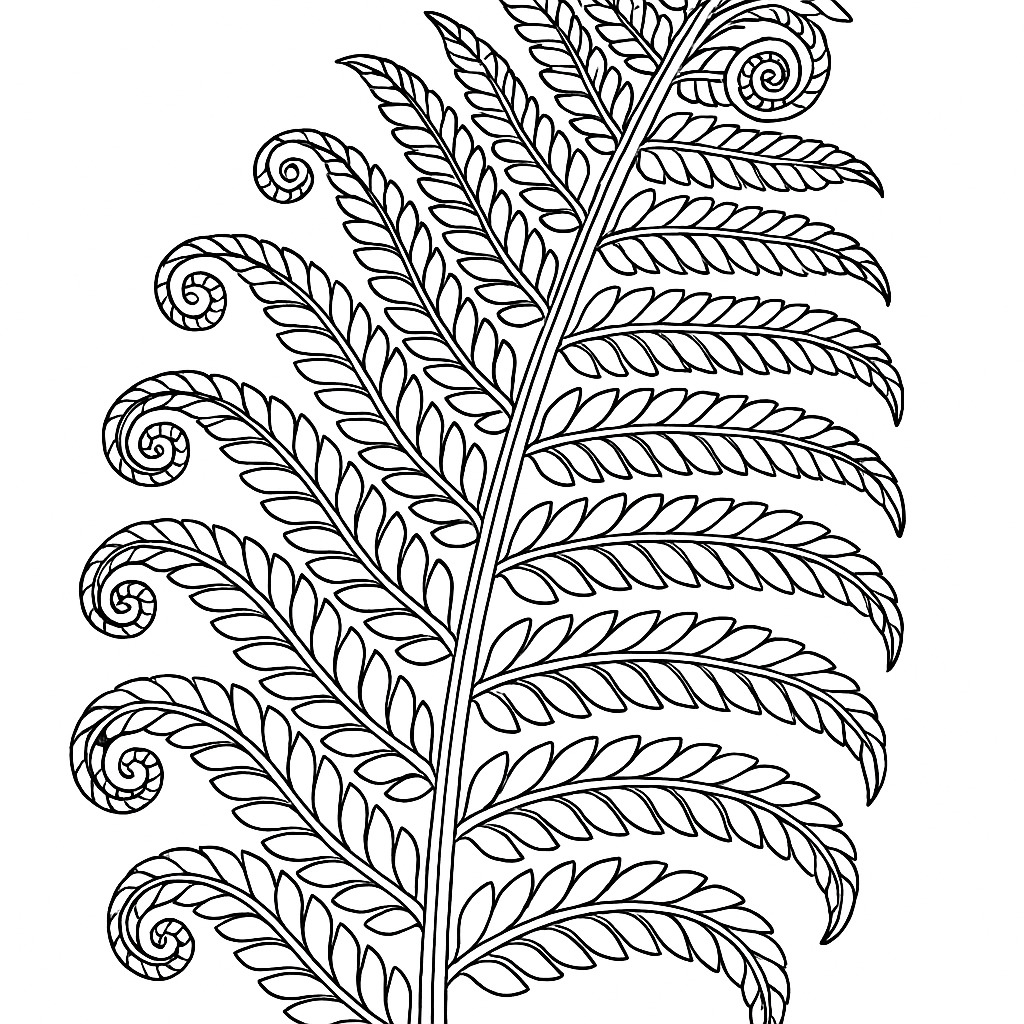 A detailed coloring page featuring fern leaf showing natural spiral patterns. Perfect for tweens (9-12) with intricate detail for a fun coloring experience.
