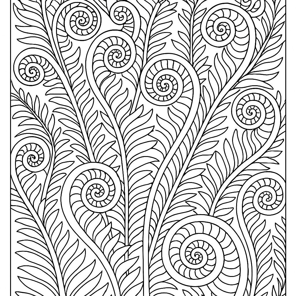 A detailed coloring page featuring spiral pattern of unfurling fern fronds in spring. Perfect for tweens (9-12) with intricate detail for a fun coloring experience.