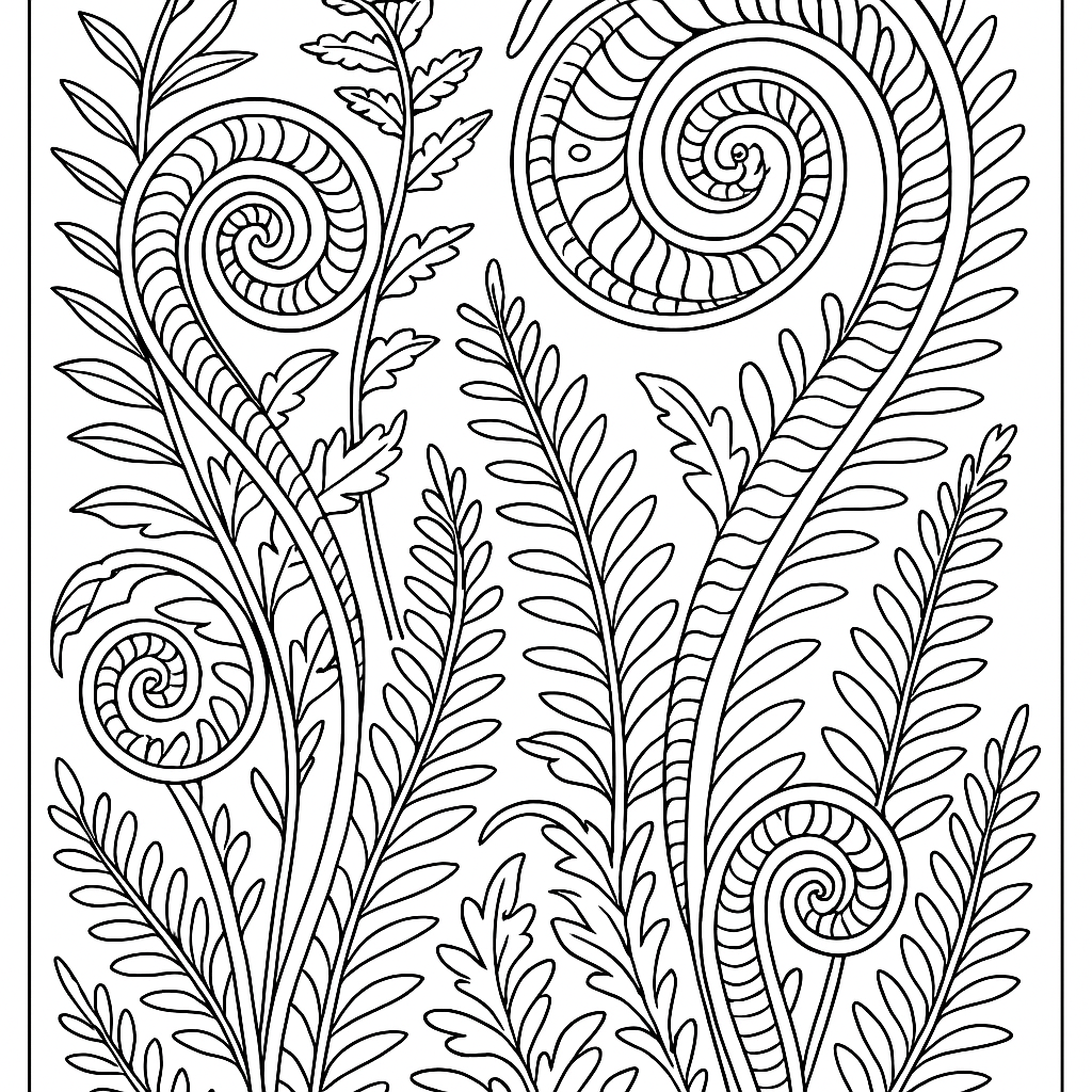A detailed coloring page featuring spiraling fern fronds unfurling in spring. Perfect for tweens (9-12) with intricate detail for a fun coloring experience.
