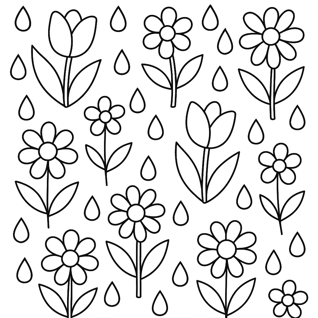 A simple coloring page featuring repeating pattern of raindrops, umbrellas, and rain boots. Perfect for kids (4-6) with large, bold outlines for a fun coloring experience.