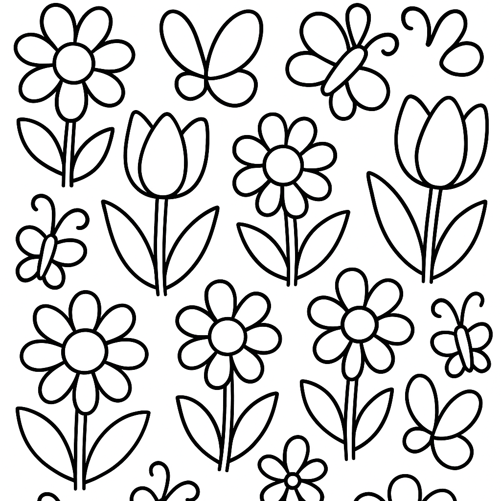 A simple coloring page featuring repeating pattern of tulips, daffodils, and crocuses. Perfect for kids (4-6) with large, bold outlines for a fun coloring experience.