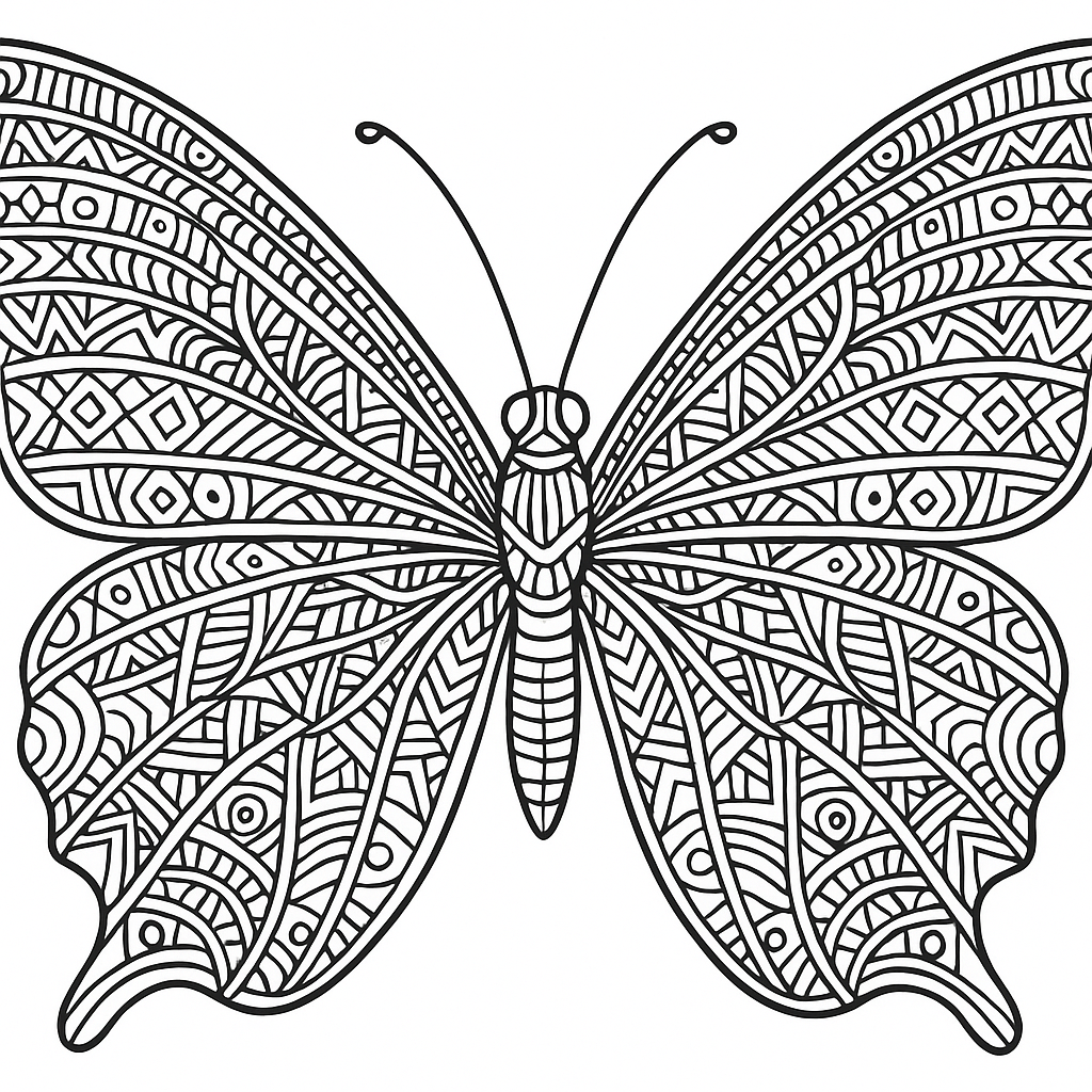 A detailed coloring page featuring intricate butterfly wing patterns with geometric designs. Perfect for tweens (9-12) with intricate detail for a fun coloring experience.