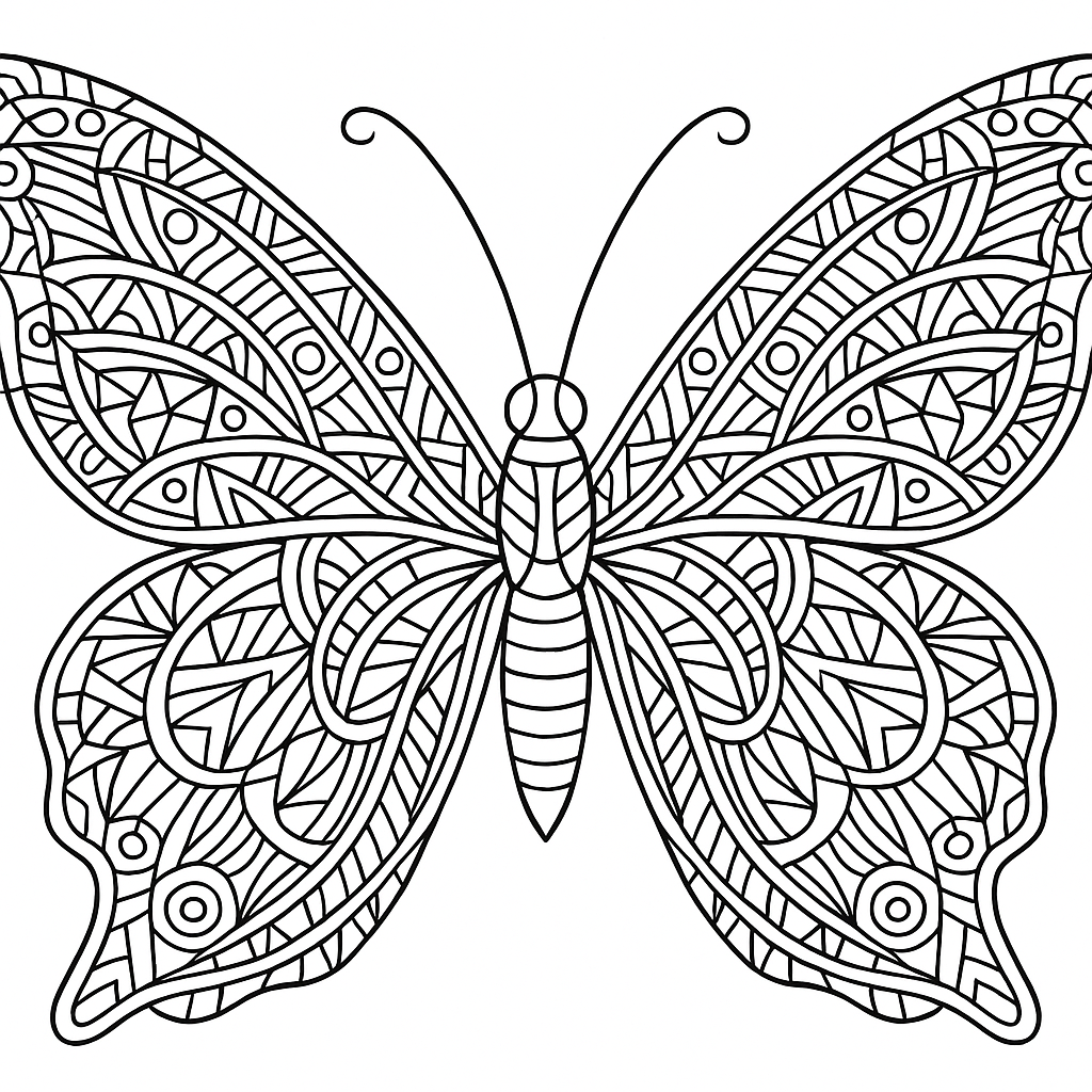 A detailed coloring page featuring intricate butterfly wings with geometric patterns. Perfect for tweens (9-12) with intricate detail for a fun coloring experience.