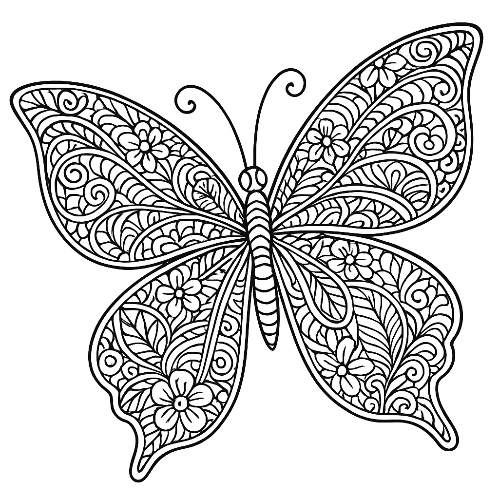 A detailed coloring page featuring zentangle butterfly with spring wing patterns. Perfect for tweens (9-12) with intricate detail for a fun coloring experience.