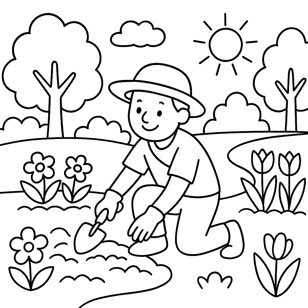 A simple coloring page featuring a gardener landscaping a public park for spring. Perfect for kids (4-6) with large, bold outlines for a fun coloring experience.