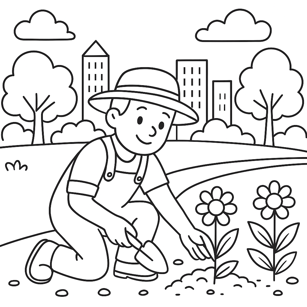 A simple coloring page featuring landscaper planting flowers in city park. Perfect for kids (4-6) with large, bold outlines for a fun coloring experience.