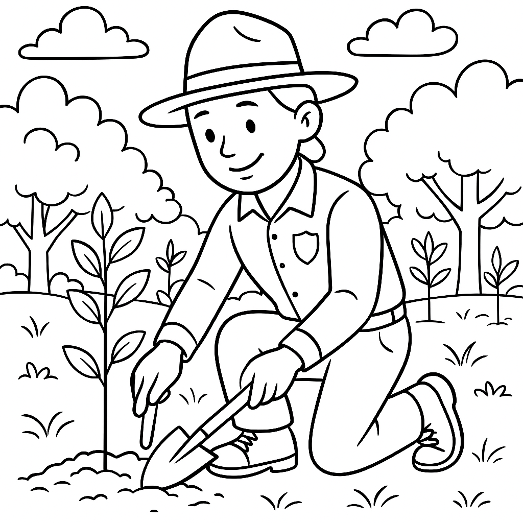 A medium coloring page featuring park ranger planting trees in a reforestation area. Perfect for kids (6-9) with moderately detailed outlines for a fun coloring experience.