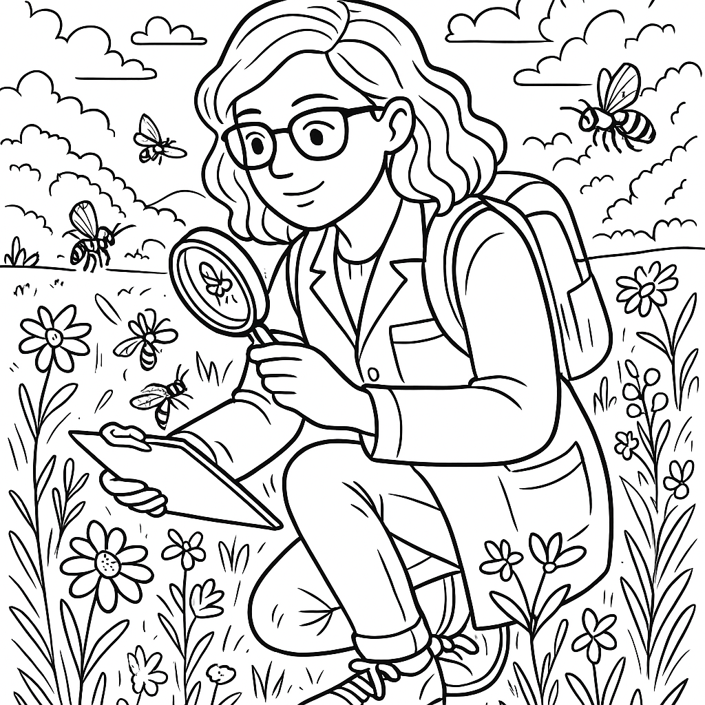 A detailed coloring page featuring scientist studying pollinator populations in field. Perfect for tweens (9-12) with intricate detail for a fun coloring experience.