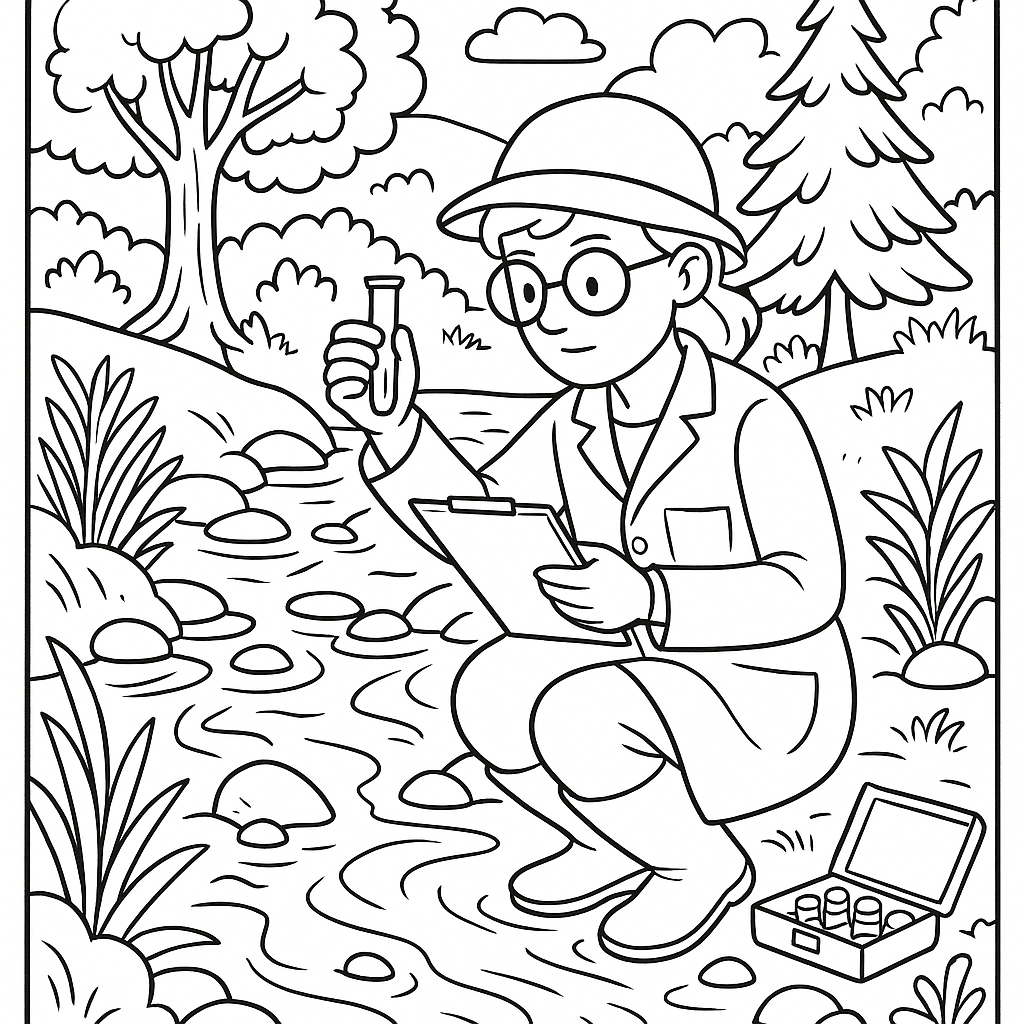 A detailed coloring page featuring scientist studying water quality in a stream. Perfect for tweens (9-12) with intricate detail for a fun coloring experience.