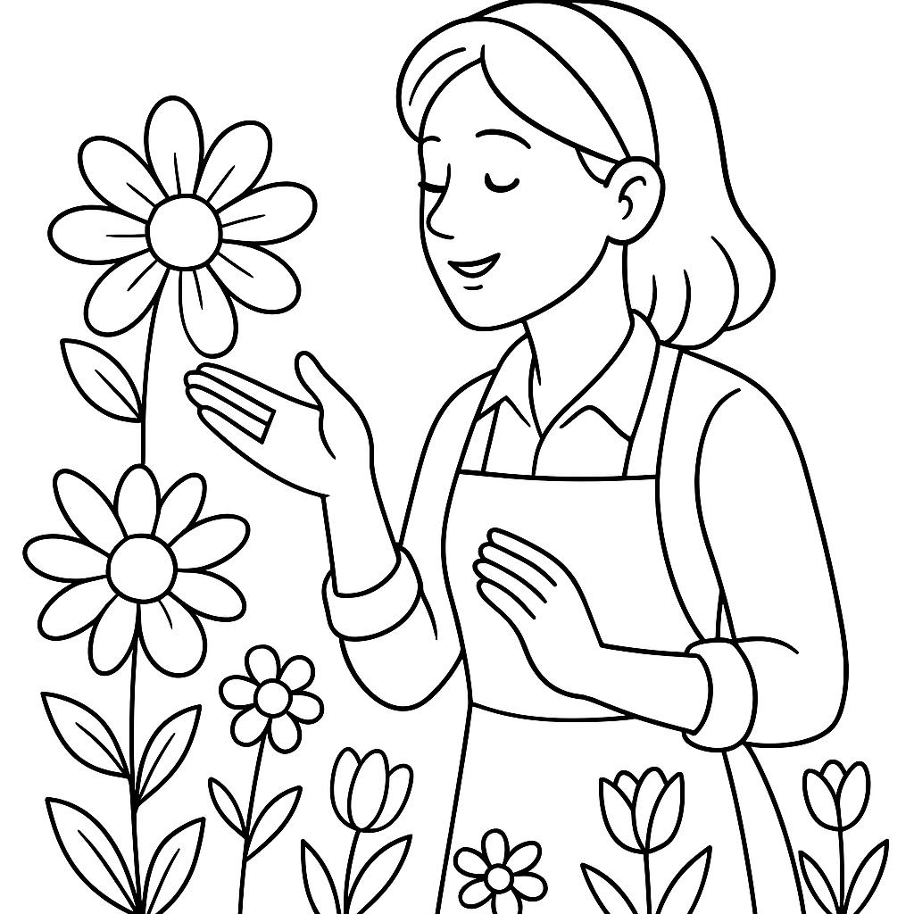A medium coloring page featuring a professional flower whisperer talking to blooms. Perfect for kids (6-9) with moderately detailed outlines for a fun coloring experience.