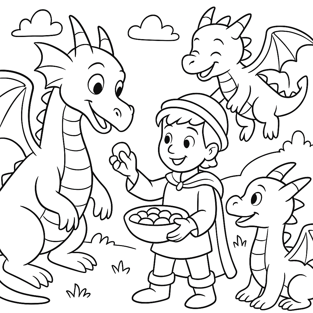 A medium coloring page featuring dragon trainer feeding friendly dragons. Perfect for kids (6-9) with moderately detailed outlines for a fun coloring experience.