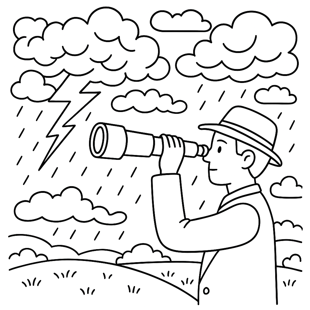 A medium coloring page featuring professional cloud watcher with telescope studying spring storm clouds. Perfect for kids (6-9) with moderately detailed outlines for a fun coloring experience.
