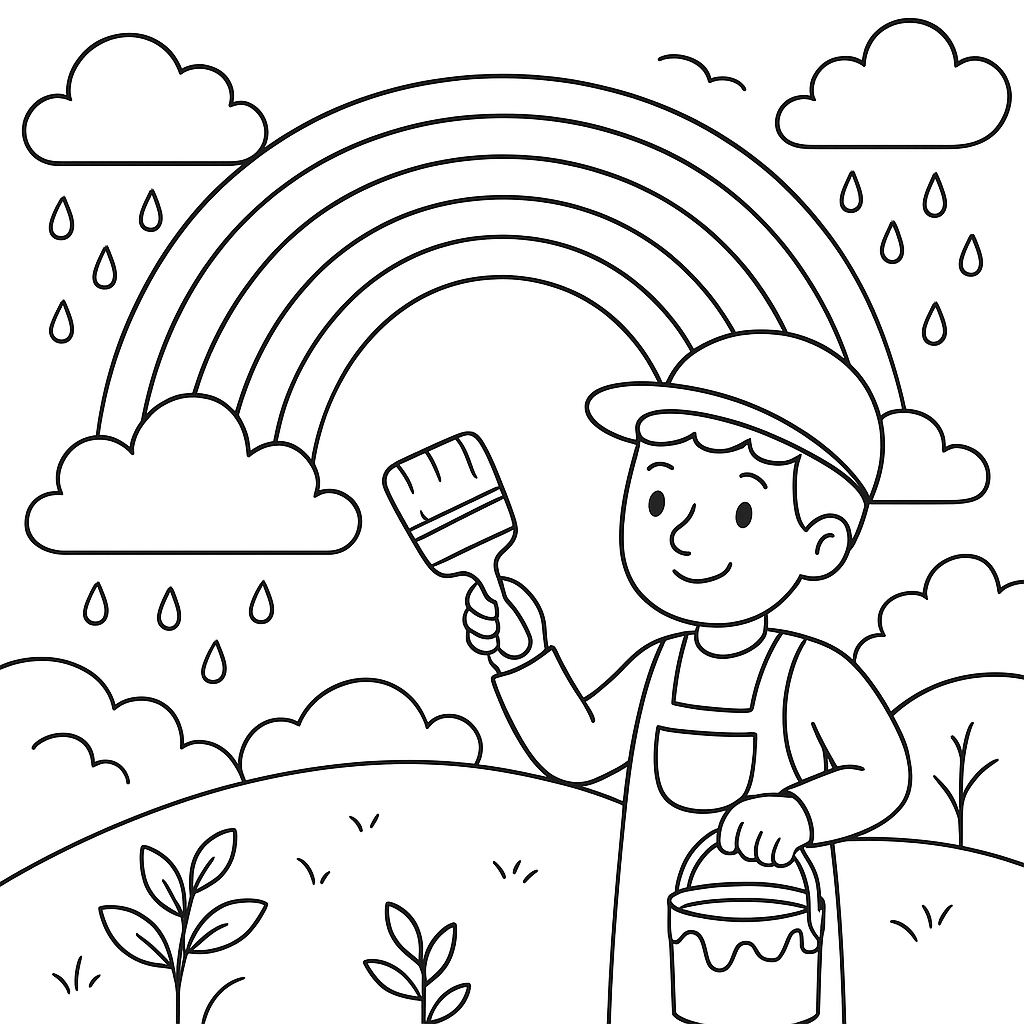 A medium coloring page featuring professional rainbow maker painting sky after spring rain. Perfect for kids (6-9) with moderately detailed outlines for a fun coloring experience.