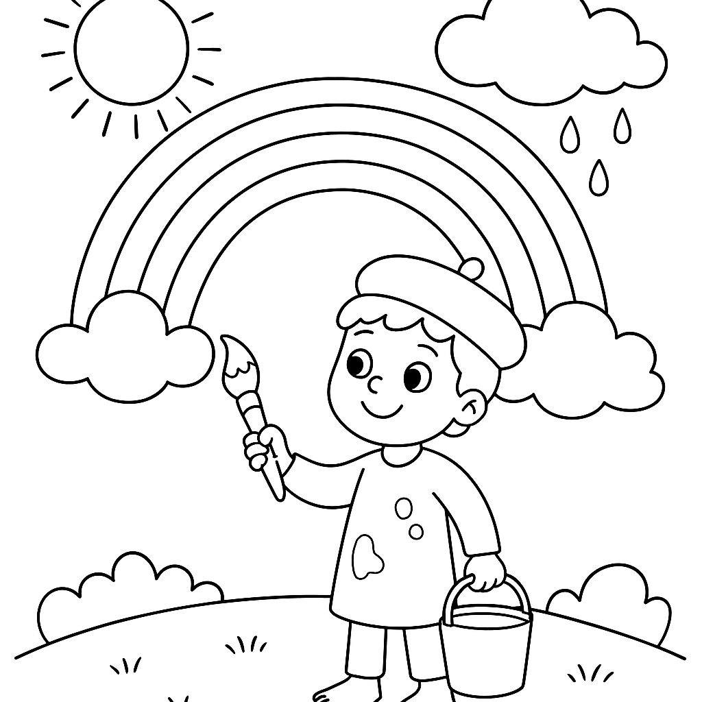 A simple coloring page featuring rainbow painter decorating sky after spring storm. Perfect for kids (4-6) with large, bold outlines for a fun coloring experience.