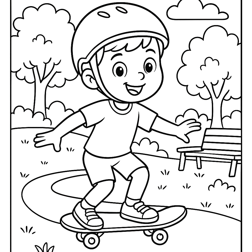 A medium coloring page featuring a child learning to skateboard in a park. Perfect for kids (6-9) with moderately detailed outlines for a fun coloring experience.