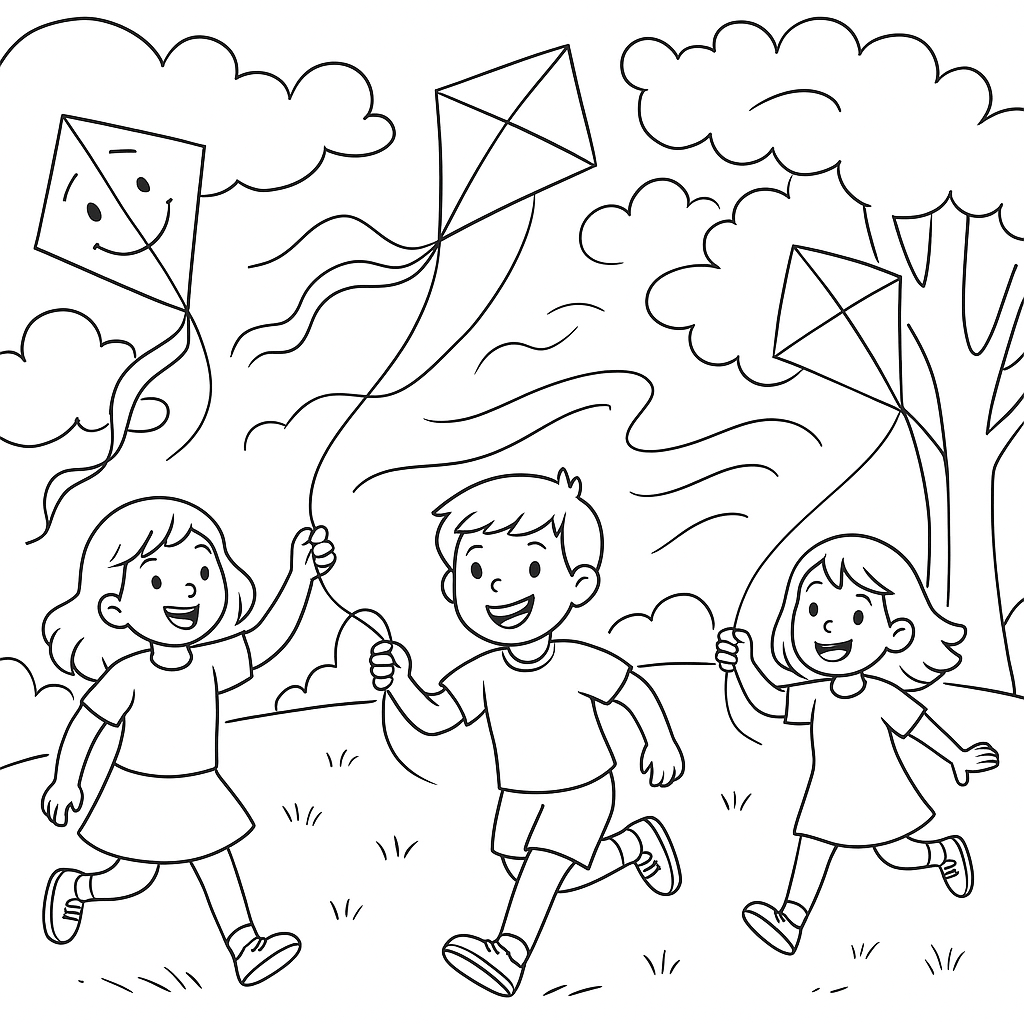A medium coloring page featuring children flying colorful kites in a park on a windy day. Perfect for kids (6-9) with moderately detailed outlines for a fun coloring experience.