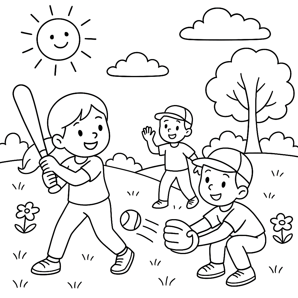 A medium coloring page featuring children playing baseball in spring sunshine. Perfect for kids (6-9) with moderately detailed outlines for a fun coloring experience.