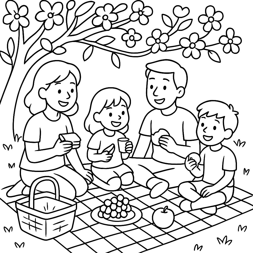 A medium coloring page featuring family having a picnic on checkered blanket under flowering tree. Perfect for kids (6-9) with moderately detailed outlines for a fun coloring experience.